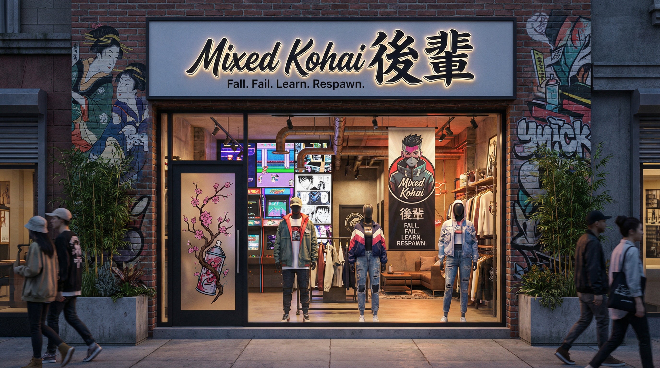 Person walking down a narrow street in an urban area with traditional and modern elements. Beige sweatshirt with a colorful graphic design on a background with cherry blossom trees and abstract patterns.